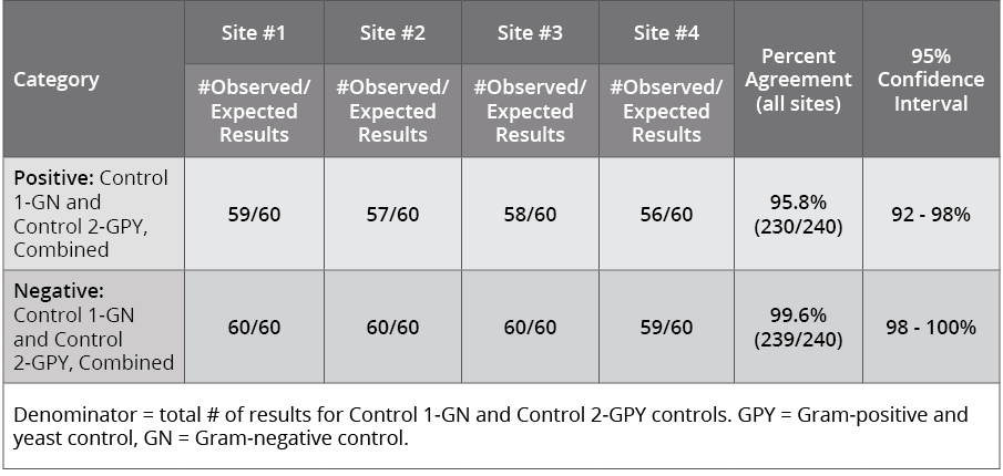 Three independent lots of MDx-Chex for BCID2 were evaluated at four different testing sites on the FilmArray Torch and 2.0 Systems using the BIOFIRE BCID2 Panel. Overall, reproducibility of the control was ≥ 96 % positive agreement (230 of 240 tests produced expected positive results). Overall negative agreement across all testing sites was ≥ 99 % (239 of 240 tests produced expected negative results).