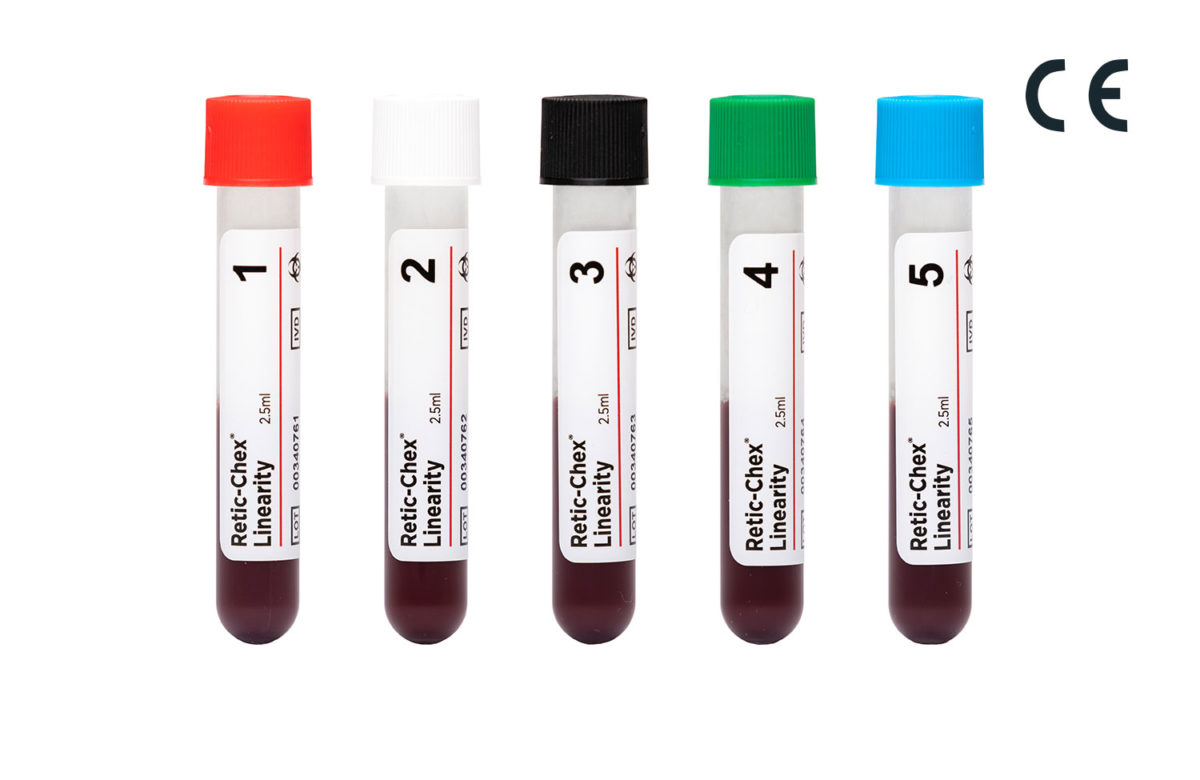 Retic-Chex Linearity for BC is an assayed linearity control kit that can be used to verify patient reportable ranges and measure the linear performance of automated and semi-automated hematology analyzers that report the reticulocyte parameter. Instrument-specific values for reticulocyte percentages are included with each kit.
