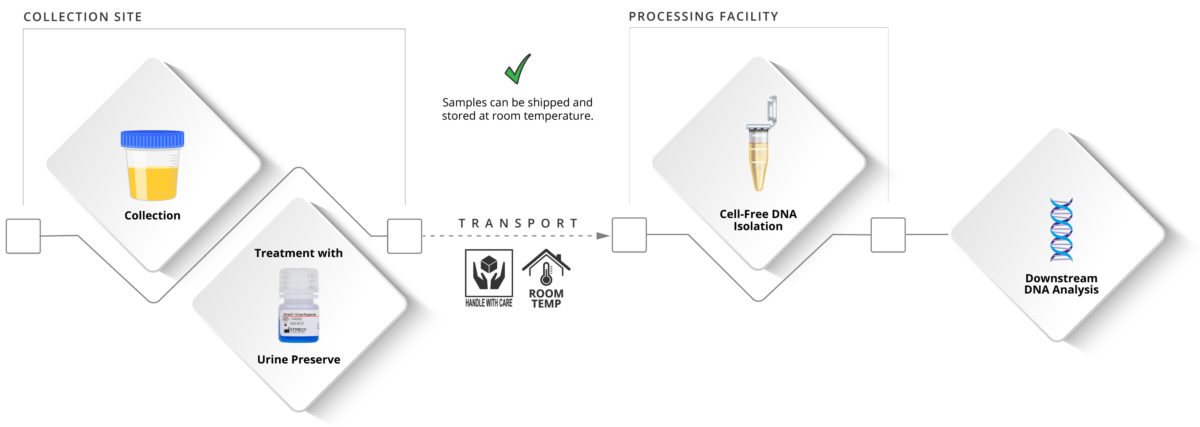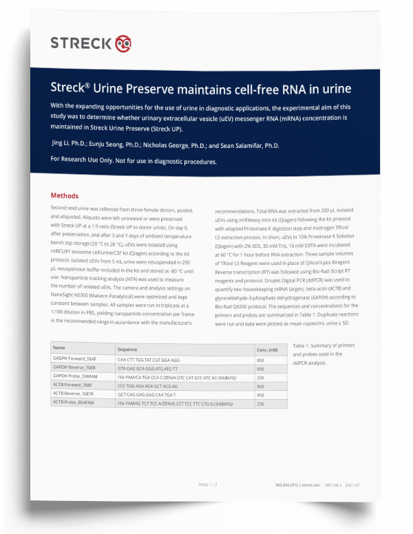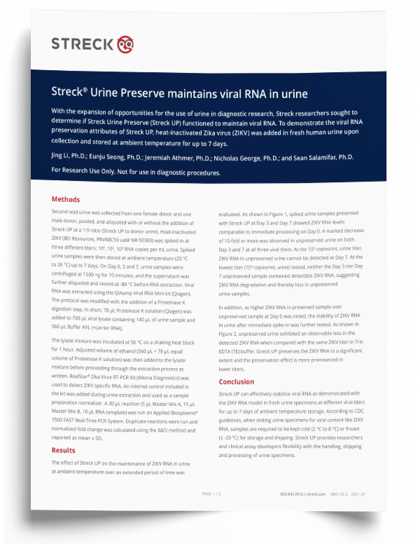 Streck Urine Preserve is a ready-to-use liquid reagent that stabilizes nucleic acid targets in urine for up to 7 days at 6 °C to 37 °C to limit changes associated with sample handling, shipping and field collection.