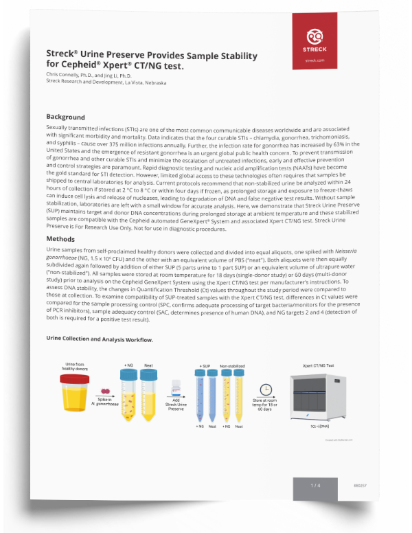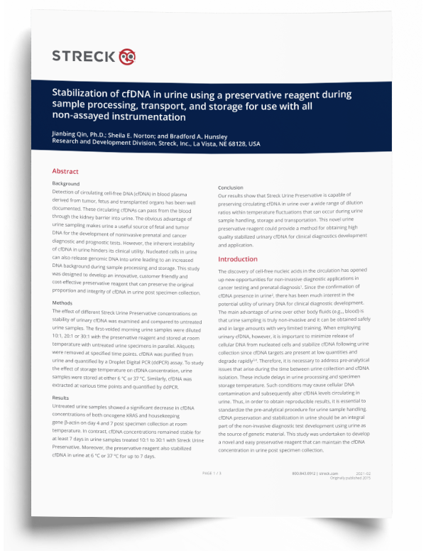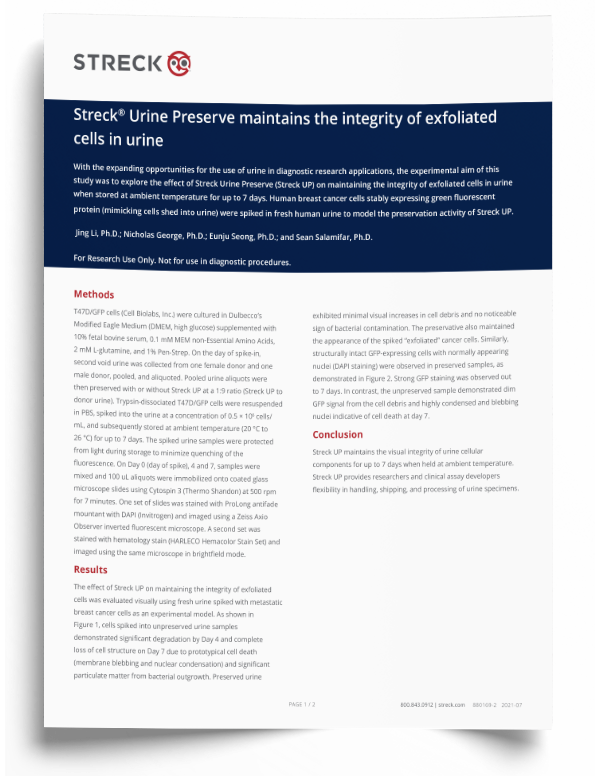 Streck Urine Preserve is a liquid reagent that stabilizes nucleic acid targets in 25 mL to 100 mL of urine for up to 7 days at 6 °C to 37 °C. This preservative limits the lysis of cellular material, which can lead to the contamination of true cell-free targets present at the time of sample collection, and inhibits the nuclease mediated degradation of nucleic acids during room temperature storage. With Streck Urine Preserve, you can implement batch processing and bulk handling while eliminating the need for immediate processing or cold chain management…